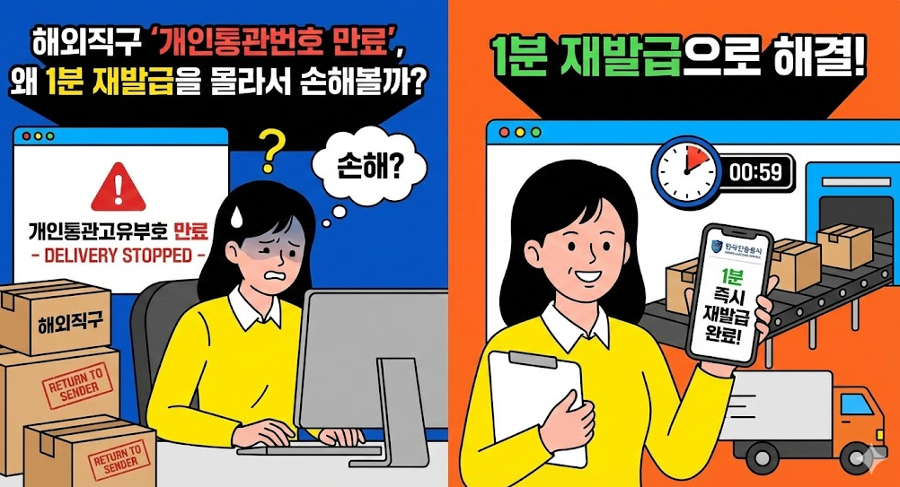 해외직구 주문 직전에 개인통관번호가 만료되었다면? 당황하지 마세요! 단 3분이면 재발급 완료됩니다. 매년 500만 건 이상의 개인통관번호가 재발급되고 있지만, 절차를 몰라 배송이 지연되는 경우가 많습니다. 지금 바로 확인하고 빠르게 재발급받으세요.